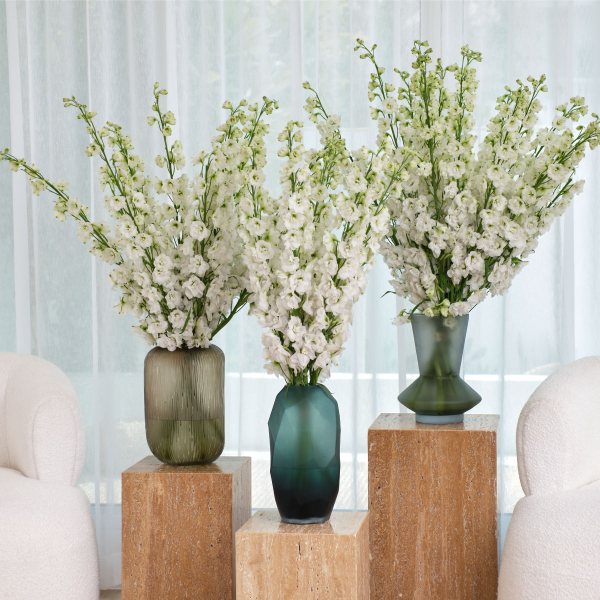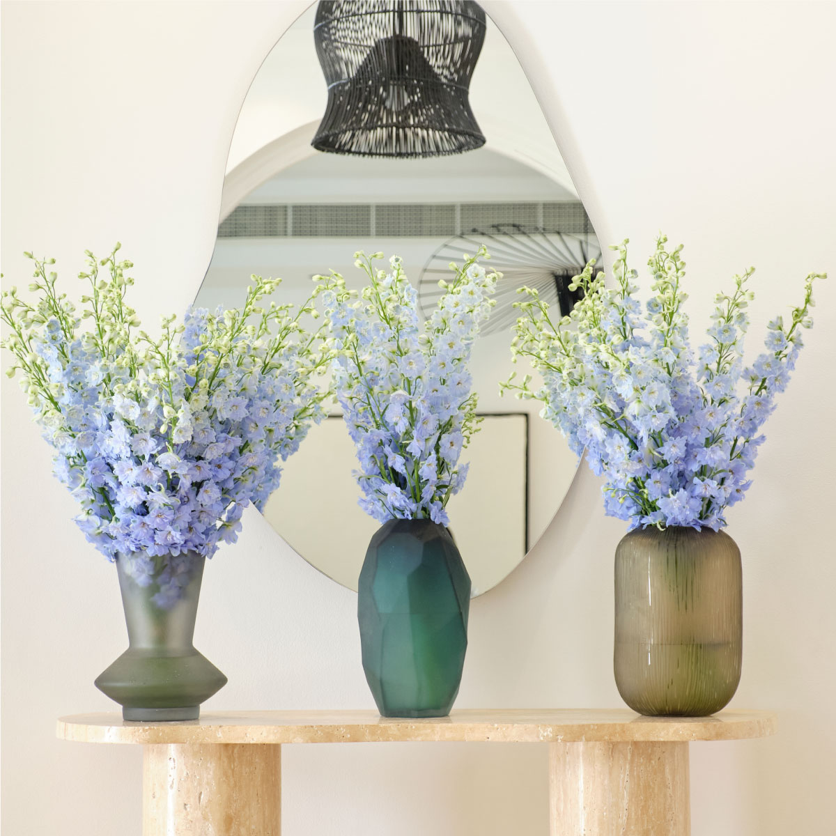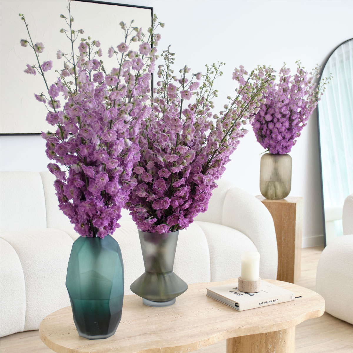 Delight in the elegance of tall, vibrant delphinium blooms, painting your space with a mesmerising spectrum of colours.